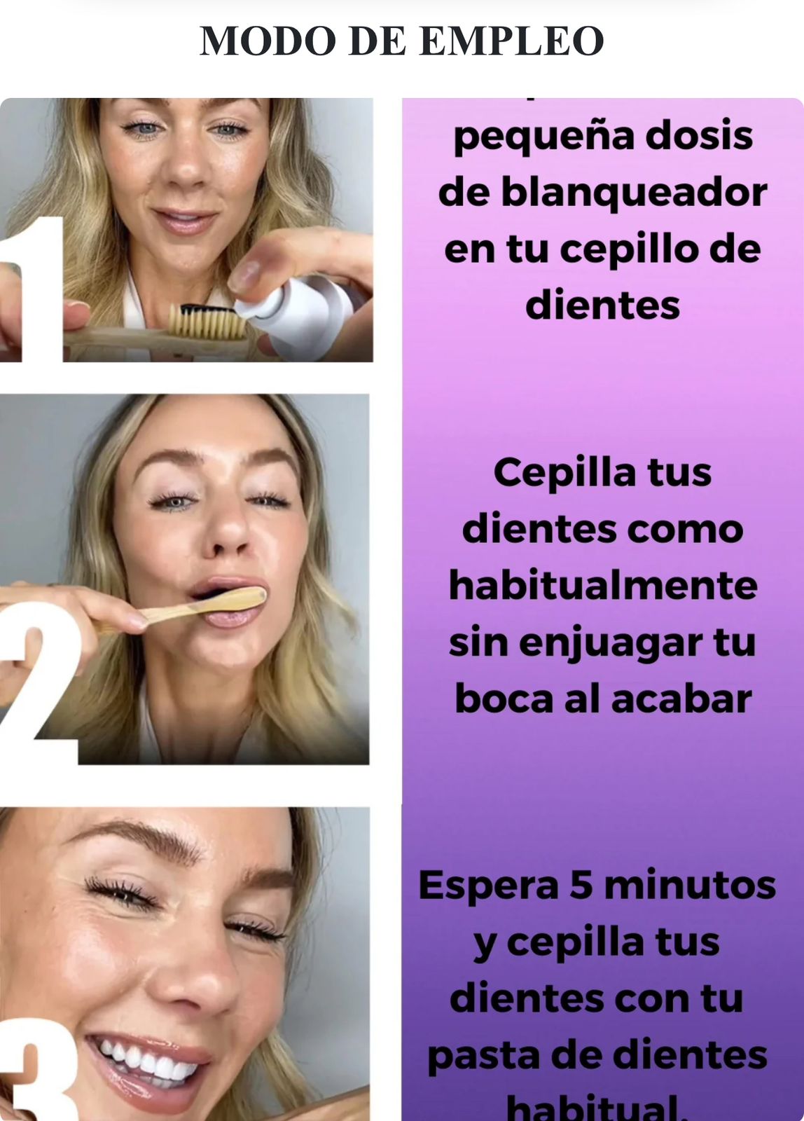 ¡Ten un blanco radiante y libre de amarillodesde el primer usosin dañar el esmalte de los dientes ni causar sensibilidad!